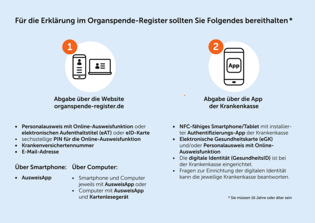 Das Register für Erklärungen zur Organ- und Gewebespende (Organspende-Register) ist ein zentrales elektronisches Verzeichnis. Hier können Sie Ihre Erklärung für oder gegen eine Organ- und Gewebespende eintragen. Das Register bietet eine neue digitale Möglichkeit, Ihre Entscheidung rechtlich verbindlich zu dokumentieren.