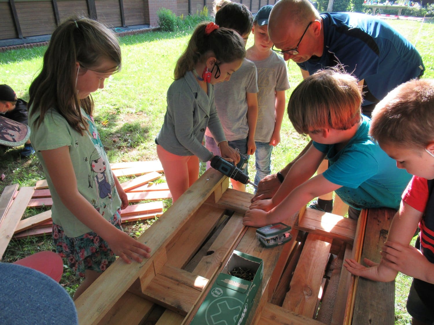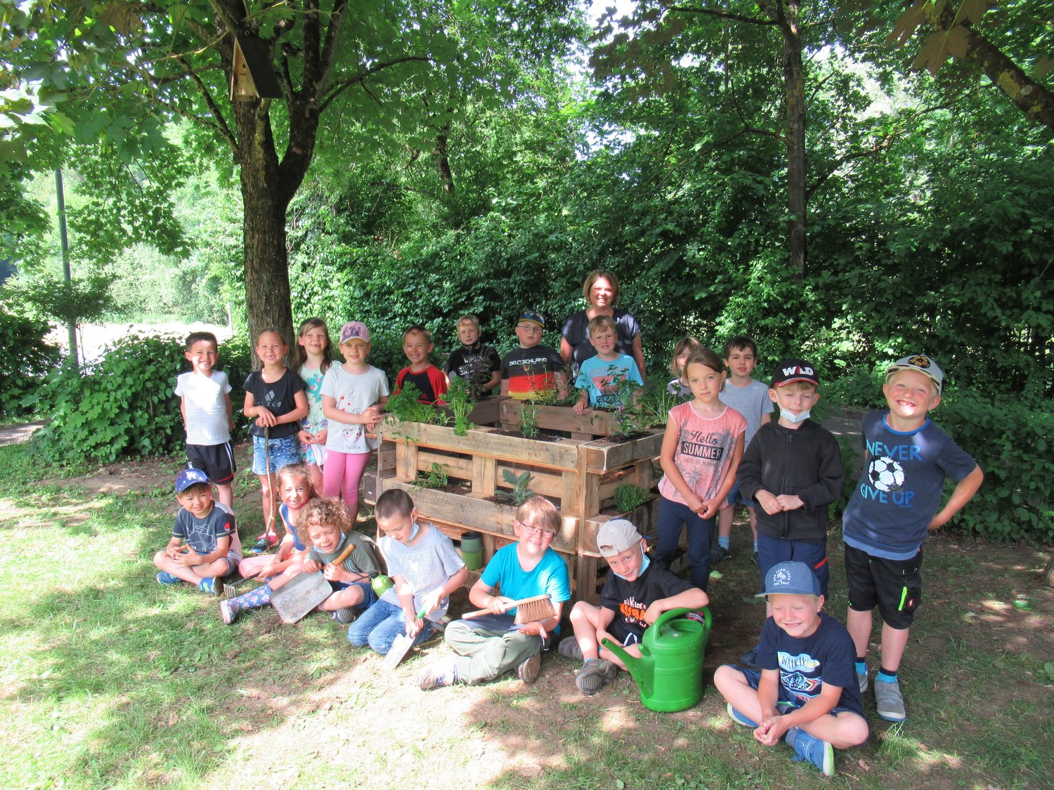 Im Rahmen der Umweltbildung bauten die Kinder der 1. Klasse im Schuljahr 2020/21 unter Anleitung unseres Hausmeisters Werner einen Kompost aus Europaletten. Hier kann zukünftig der Biomüll der Schule entsorgt werden. Um den Kompost zu verschönern, machten sich die Erstklässler nach dem Bau auf den Weg in die ortsansässige Gärtnerei Rückel. Dort kauften sie verschiedene Kräuter. Zur großen Freude der Kinder bekamen alle Schüler eine kleine Blume geschenkt. Die gekauften Kräuter wurde in den Rand des Kompost gepflanzt. Alle Erstklässler freuen sich nun auf den ersten Kräuterquark aus frisch geernteten Kräutern.