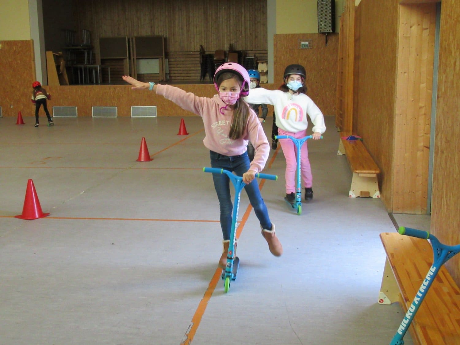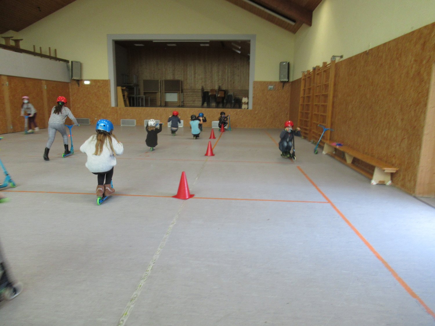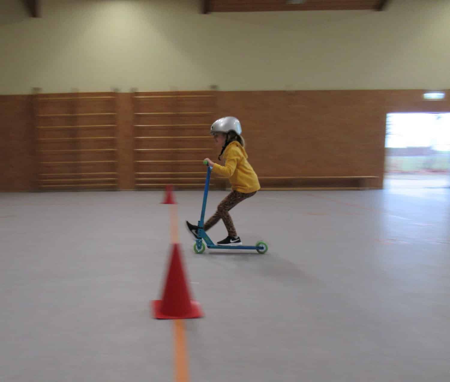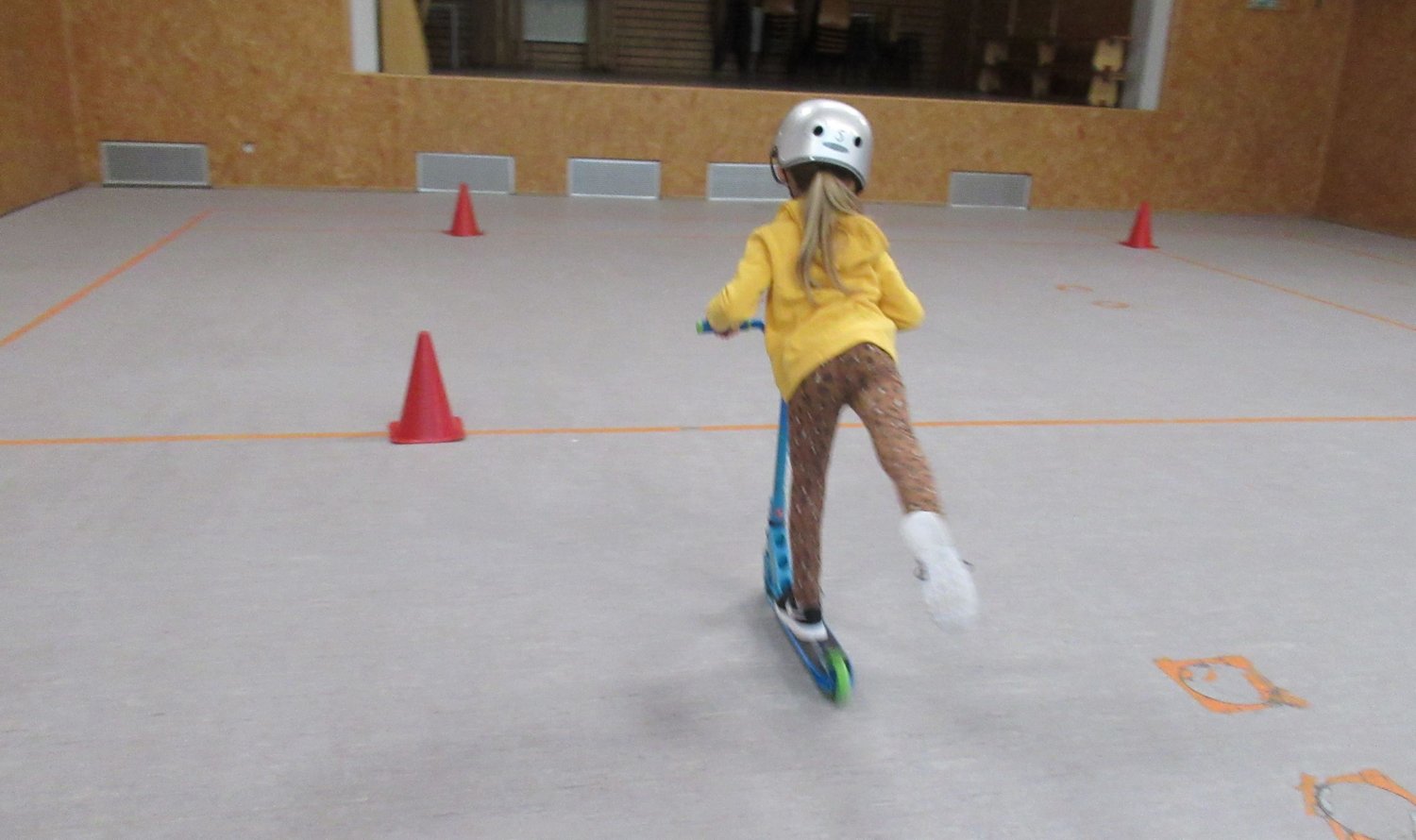 Zunächst wurde Bremstechniken trainiert. In verschiedenen Spiel- und Übungsformen wurde das Gelernte angewandt. Anschließend ging es um die Sensibilisierung für Gefahrensituationen im Alltag, wie das Überwinden von Hindernissen auf der Fahrbahn.