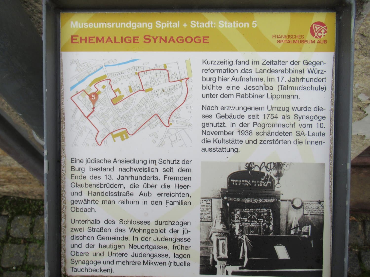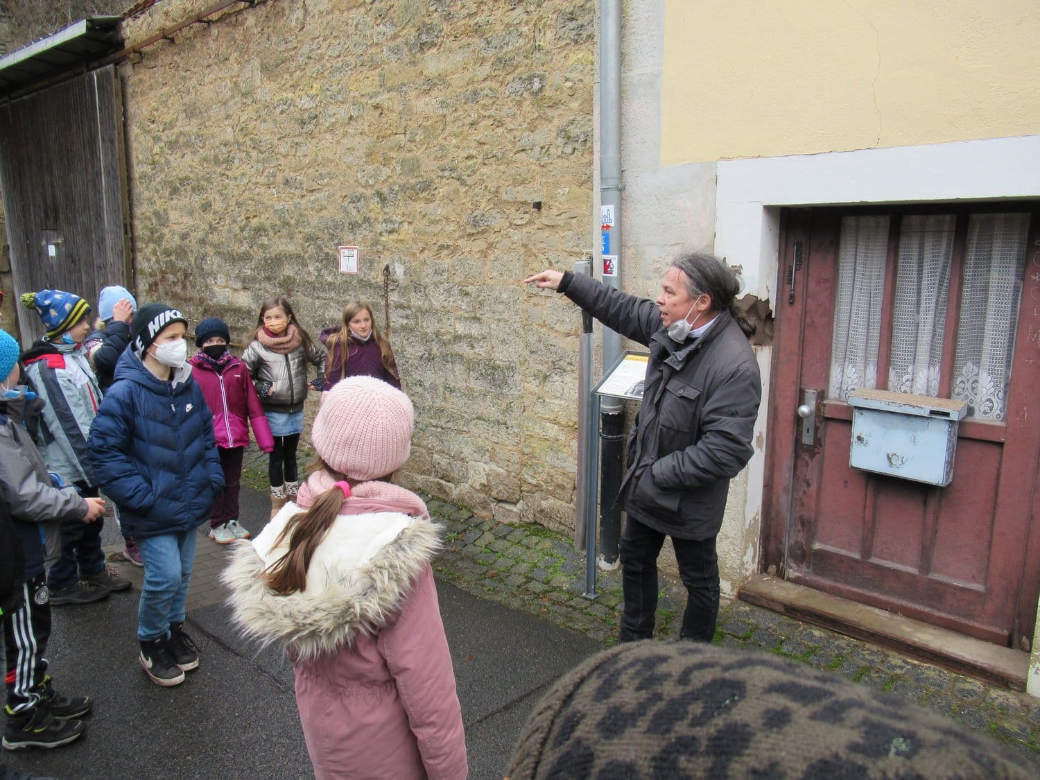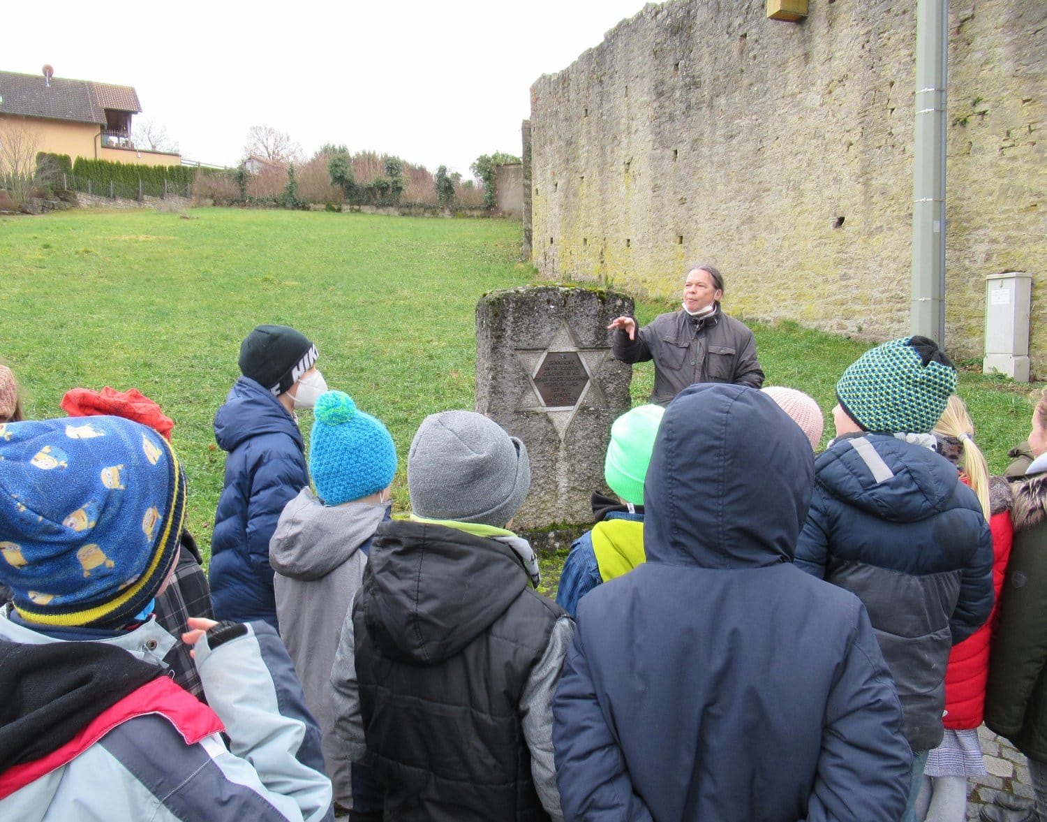 Nachdem sich die Schülerinnen und Schüler zuvor im Religionsunterricht ausführlich mit dem Thema Judentum beschäftigt hatten, führte Pfarrer Gregor Sauer sie und ihre Religionslehrerin durch das Judenviertel und bis zum jüdischen Friedhof. Er berichtete viel Interessantes und Wissenswertes über das jüdische Leben in Aub seit dem Mittelalter und sparte dabei auch die dunklen Kapitel der Ausgrenzung, Vertreibung und Vernichtung nicht aus.