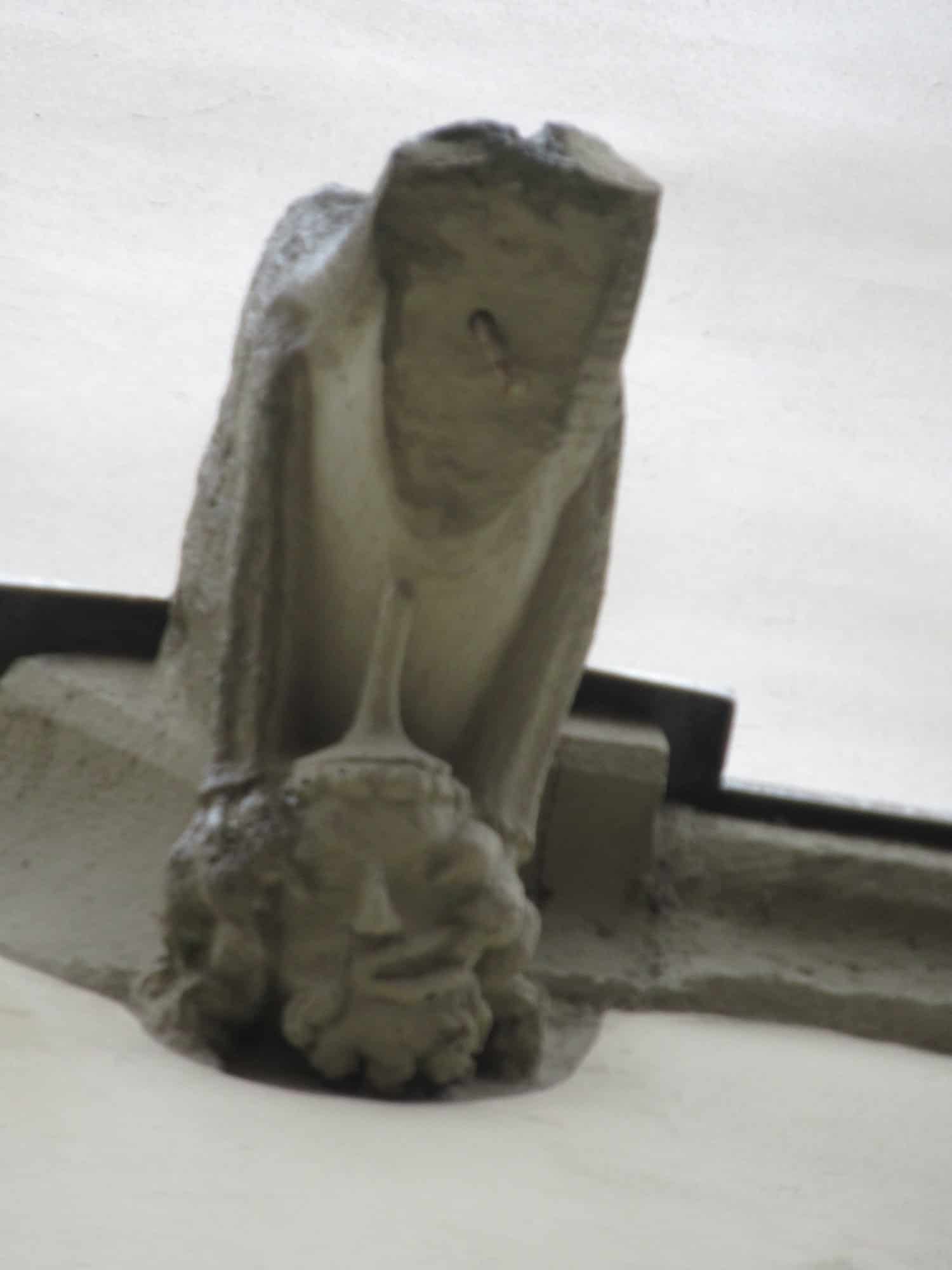 eine mittelalterliche Steinfigur, die einen Juden darstellen und verspotten soll, an der Außenwand der katholischen Stadtpfarrkirche,