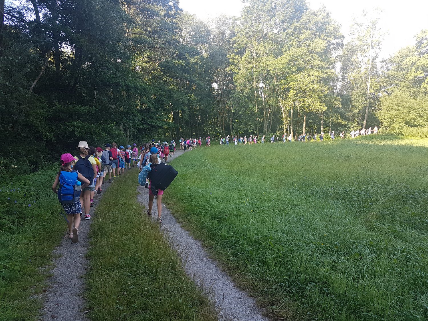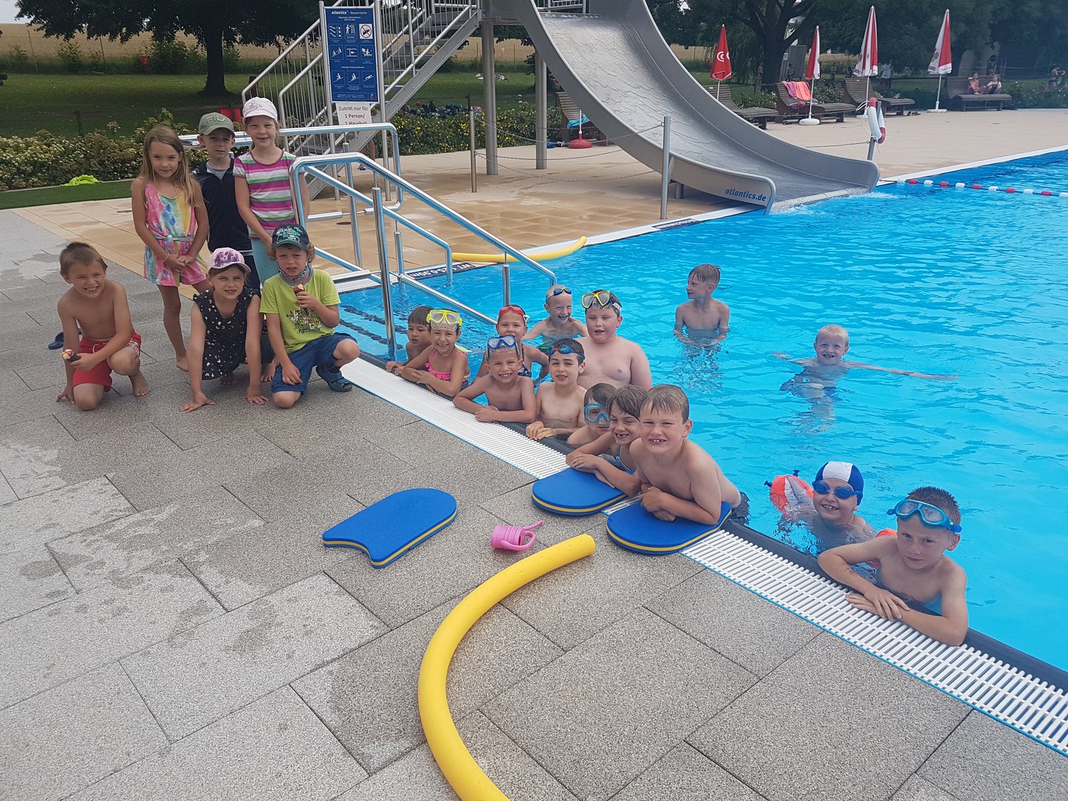 In der letzten Schulwoche vor den Sommerferien machten sich alle Klassen zu Fuß auf nach Baldersheim. Ziel war das dortige Freibad. Coronabedingt durfen die Kinder zwar nur im 15-Minuten-Takt klassenweise ins Wasser, somit war aber genug Platz auf der Rutsche und im Becken. In den Badepausen wurde gespielt oder ein Eis am Kiosk gekauft. Es war ein schöner Abschluss eines besonderen Schuljahres.